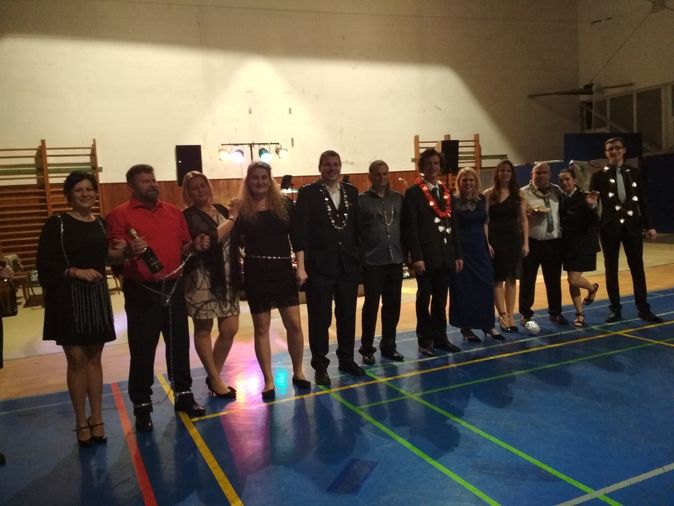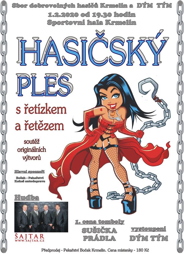 Hasičský ples 2020 - infoVšichni finalisté soutěže o nejoriginálnější nositele řetízků a řetězů. První únorová sobota roku 2020 s termínem 1.2.2020 patřila hasičskému plesu v Krmelíně. Letošními symboly byly řetízek a řetěz a v soutěže o nejoriginálnější nositele těchto doplňků se zúčastnily jak dámy tak pánové. V úvodu plesu byl představen program, možnosti občerstvení, večeří ve Sportklubu a pozvání do pekla na široký sortiment alko a nealko nápojů. Původně ohlášenou kapelu Šajtar z důvodu termínové kolize nahradila kapela 4Fourband, hrající pod stejným manažerem. Hned po zahájení plesu se mohli návštěvnící zabavit psaníčky pro štěstí o drobné ceny, vyhrát se daly malé a velké panáky alkoholu, nealko a drobné pochutiny, byly zde i hodnotnější ceny jako láhve vodky, bufet, večeře a také hlavní cena barevná inkoustová tiskárna Canon. Soutěže o nejvtipnější a nejoriginálnější nositele se zúčastnily různé týmy nebo jednotlivci, na třetím místě skončil náč člen s náhrdelníku z řeězu, na druhém místě se umístil chlap s řetízkovým náhrdelníkem doplěnými čili papričkami a vítězství si vybojovala dvojice - paní s řetězovým náhrdelníkem, vedoucí svého muže svázaného do řetězových pout zločince. Vátězná dvojice vylosovala vítěze slosovatelné místenky. Skupina DýmTým zvolila pomalý nástup na hudbu z filmu 1492 Dobytí ráje. Otrokář s fousy vedl na řetězu pětici vězňů v roztrhaných bílých mundůrech. Po příchodu na místo je ještě zbičoval a potupně srazil k zemi. Vzápětí si nasadil licousy a motýla, tím okamžikem se proměnil v Ivana Mládka a vzápětí začal hrát píseň Jožin z bažin. Vězňové, když přišlo na refrén, se z řetězu osvobodili a začali Ivana doprovázet šíleným tancem, pak obklopili nebohého zpěváka a dělaĺi na něj potupné obličeje a grimasy. Druhý refrén byl rovněž doprovázen zběsilým tancem vězňů v řadě. Poslední část vystoupení byla na motivy hitu YMCA od skupiny Village people. V přídavku skupina závěrečnou pasáž YMCA zopakovala. Tombola lákala na mnoho různých a hodnotných cen, od poukazů na zubařská vyšetření a dentální hygienu, posouzení postavy a výživové poradenství, dále zde byly pochutiny, PET láhve piva, vína i alkoholu a mnoho dalších užitečných předmětů. Také zde byly elektrospotřebiče od p. Kokeše, poukaz na střelbu do Staré Bělé a hlavní cena od Pekařství Boček - kondenzační sušička prádla ECG ETF 1270 DA++. Kapela 4Fourband hrála stále lépe a návštěvníci se mohli taněčně vyžít až do konce.
