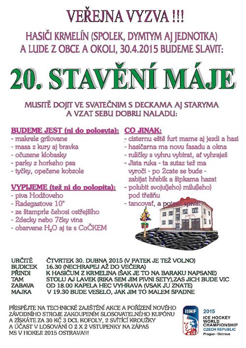 Stavění máje 2015 - infoVe čtvrtek 30.4.2015 na prostranství před hasičským domem s novým nátěrem a garážovými vraty proběhlo na základě veřejné výzvy 20. stavění máje. Účastníci mohli podpořit pořízení nového závodního stroje a technické zajištění akce zakoupením slosovatelného kupónu a vyhrát 2x2 vstupenky na zápas MS v hokeji Ostrava!!!. Čepoval se Radegast a ležáky z Minipivovaru Hodže. Na jídlo tradiční grilované makrely na novém grilu, vepřové a kuřecí steaky a hotdogy. Probíhal 20. ročník soutěže v házení šipek a zabíjení hřebíků, lidi si mohli vytáhnout šťastnou rukou ruličky, jak v dětské, tak dospělé verzi malé tomboly. Hudbu obstáraval výběr z kapely HEC z venkovního pódia. Stavění májky bylo řízeno komentátorem, který bavil návštěníky. Další fotografie ve fotogalerii.