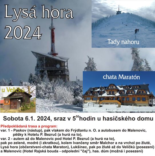 Lysá hora 2024 - infoVýšlap na Lysou horu se uskutečnil v první lednovou sobotu roku (6.1.2024). Po vyhodnocení obou variant přesunu k hotelu Petr Bezruč byla vybrána ta jednodušší. Autem Ford jsme dojeli až pod hotel místo přesunu přes Paskov-Frýdlant n. O, Malenovice (vlak+autobus). Předpověď počasí na ten den moc příznivá nebyla, poměrně hustý déšt skoro na celé polovině republiky komplikoval výšlap při začátku výšlapu. Při znalosti hory byla zvolena nová trasa, která od hotelu směřovala vpravo lesem, oproti jiným rokům, kdy jsme se drápali příkrou zkratkou. Po dosažení lesní cesty, která vedla od spodního rozcestí, jsme dorazili k hornímu, odkud vedou dva směry, vlevo po vyšlapané pěšině nebo vpravo opět strmě lesem. Další úsek, cestou vlevo, probíhal poklidně i s pauzou na občerstvení. Jakmile jsme dosáhli další hlavní cesty, směřující od vrcholu Hradová až po vstup do prvního označkovaného turistického modrého úseku se naše výprava rozdělila na dvě skupiny, první postupjící zkratkou a druhou, po cestě, která sice směřovala krátce dolů, ale stejně se po ní utrženci dostali na stejný výchozí bod - vchod do druhé zkratky (na turistické trase), nechtěli-li se odtamtud projít další oklikou kolem mohyly na Ivančeně. Když první skupina dorazila na cestu od Ivančeny, vyčkala příchodu skupiny druhé a společně jsme postupovali až na Malchor. Déšť se v těchto místech měnil na sníh a už nebyl tak otravný. Od Malchoru je to k začátku výšlapu ze severní strany kousek. Bývalá sjezdovka má vybudované kamenné chodníky, které byly přikryty vrstvou sněhu a umožňovaly "snadný" výstup. Tím, že bylo tak špatné počasí, jsme na vrcholu Lysé hory při focení taktak chytili jinou skupinku, s nímž jsme si vzájemně vyměnili fotografickou chvilku. Při posezení v Bezručově chatě nechyběly zelňačka, česnečka, fazolačka, čaj, pivo ani klíďopíďo. Sestup směr Ostravice vždy obsahuje potkávání poutníků, zpravidla stoupajících nahoru. Po zastávce v posezení Pod Šebestýnou jsme nabrali směr Malenovice. Na trase, jak je známo, stojí Hospoda u Veličku, kde proběhlo malé občerstvení a krátké vystoupení hosta-klavíristy, který zahrál pár evergreenů. Jaké bylo naše překvapení, když jsme po příchodu do Malenovic nalezli Hotel Rajská Bouda uzavřen. Přesun do jiného podniku v obci, restaurace Pod Borovou, byl vynucen. Ale i když to byla naše první návštěva zde, mohli jsme sice o něco dráže ochutnat tradiční česká jídla a zapít dobrým mokem. Auto Ford nás dopravilo zpět do HD a náš letošní výšlap se tímto uzavřel.. Rok 2024 znamenal zlom, vyýšlapu se zúčastnilo 8 hasičů a 1 hasička.
