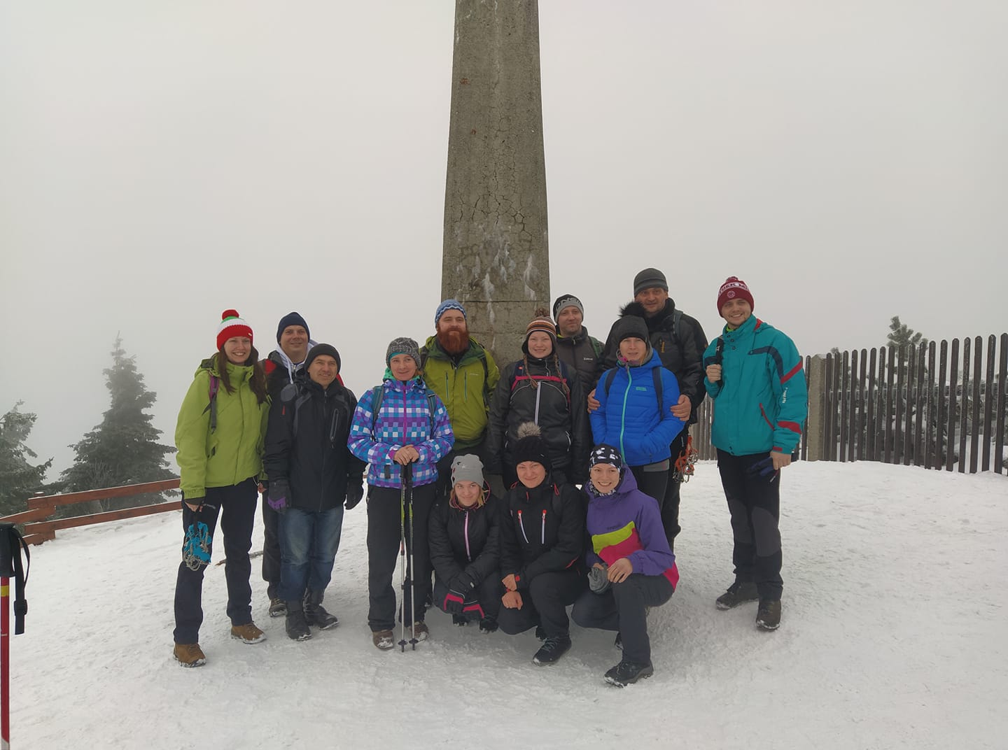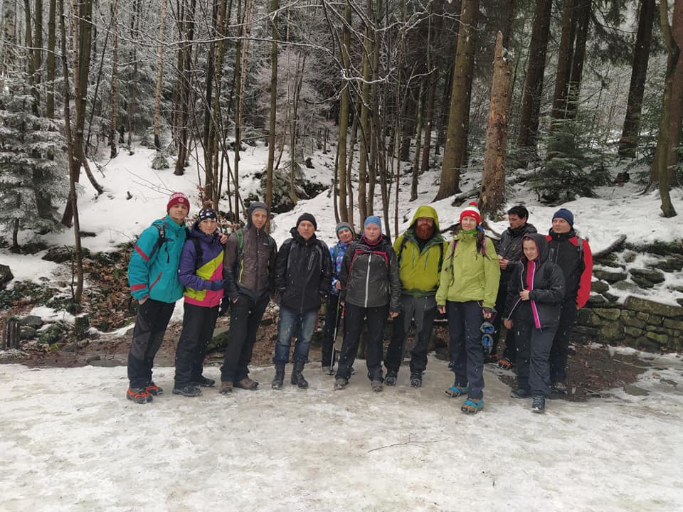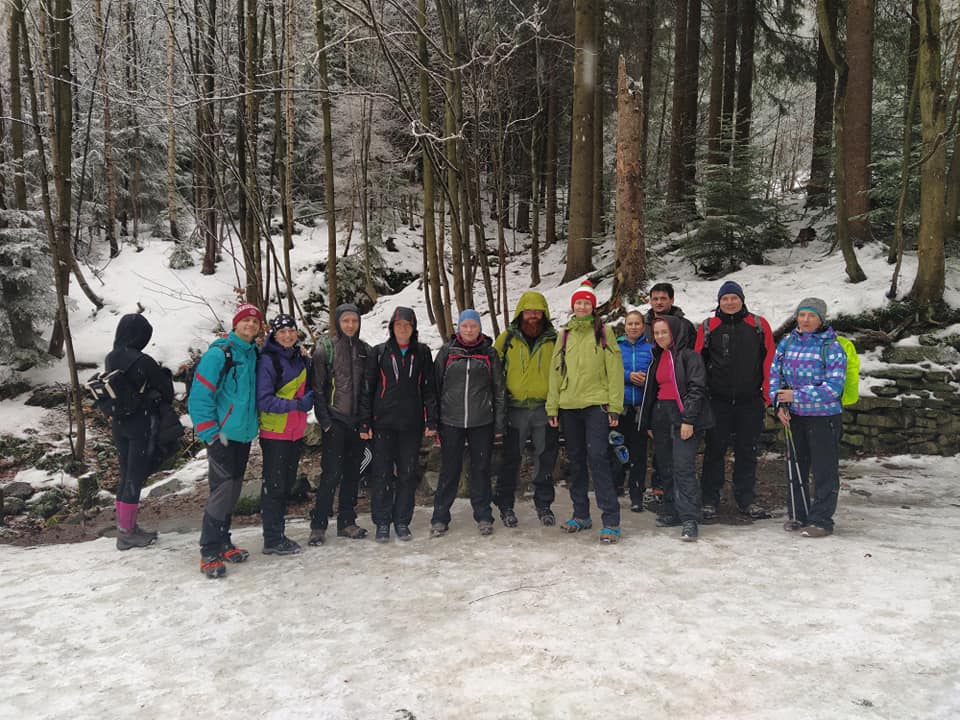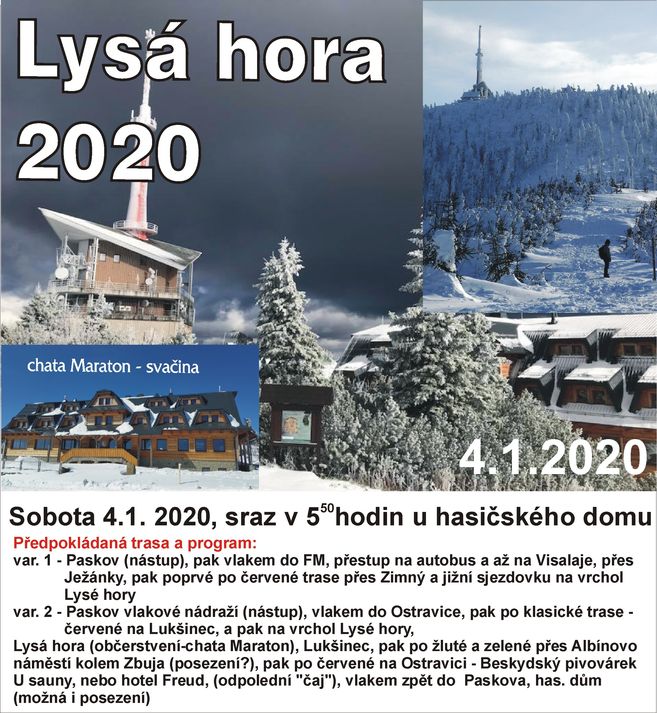 Lysá hora 2020 - infoPrvní sobotu roku 2020 jsme se dle plánu sešli ke společnémmu výšlapu na Lysou horu. Tradičním začátkem cesty, na vlakovém nádraží v Paskově, kde již nelze koupit jízdenky v budově nádraží, alébrž ve vlaku jsme vyjeli deštivým ránem do Frýdlantu n. O a přestoupili tam do motoráku směr Ostravice. Ta nás přivítala poměrně silným déštěm. Malou komplikaci řešily hlavně dámy, když nikde poblíž nádraží nebylo otevřené jediné WC. Před osmou hodinou jsme vyrazili po dlouhé době na klasickou tzv. Bezručovu trasu z Ostravice po červené značce, vedoucí zpočátku asfaltovou cestou. První zastávka u trasnformátoru, sundávání oblečení a nasazování nesmeků. , déšť se naštěstí měmil ve sníh, který přikrýval zledovatělý povrch cest a umožňoval účastníkům bez ozubených pomocníků bot lépe se držet povrchu a eliminivat riziko podklouznutí a pádu. Další setkání všech skupin u studánky se společnou fotkou a hurá dále. Tuhle trasu jsme šli loni dolů ale nahoru už před několika lety. Posledním společným setkáním prvních 3 výstupových skupin se stal altánek na Lukšinci. K vrchulu zbývá posledních 2,5 km a tak každý vyrazil až načerpal dostatek sil k poslednímu úseku. Frekvence ostatních turistů narůstala, neb ve stejném čase se rozhodlo vylézti na Lysou značné množství lidí. První z našich dorazili na vrchol před půl jedenáctou a získali strategická místa v chatě Maratón, s vědomím, že budou dorážet další a také se budou chtít posadit v klidu ke stolu, pojíst a popít. V poklidu jsme debužírovali a uživali klidu a pohody po náročném výšlapu. Jakmile byli všichni dostatečně odpočati, ustoupili jsme dalšímu tlaku stále přicházejícím lidem, někteří po zakoupení jídla a pití s ním kroužili po restauraci a hledali volná místa, my po opuštění úlevně opustili bobtnající sál a zdolali poslední úek k mohyle, kdež jsme uskutečnili vrcholové foto. Zpáteční cestu má každý rád, už kvůli dalším desítkám a stovkám dalších lidí, kteří se vydali plahočit se nahoru až po nás. Na Lukšinci u altánu jsme nezahli zpět vlevo, nýbrž pokračovali rovně až k místu, kde odbočujeme zase doprava směr Malenovice. Cesta pak probíhala klidně přes Albínovo náměstí a kolem Zbuja až na Ostravici do Sauny. Přechod k vlaku a odjezd přímo do Paskova, odkud jsme pokračovali domů. Akce se zúčastnilo 13 účastníků, po třech letech opět bez psa.