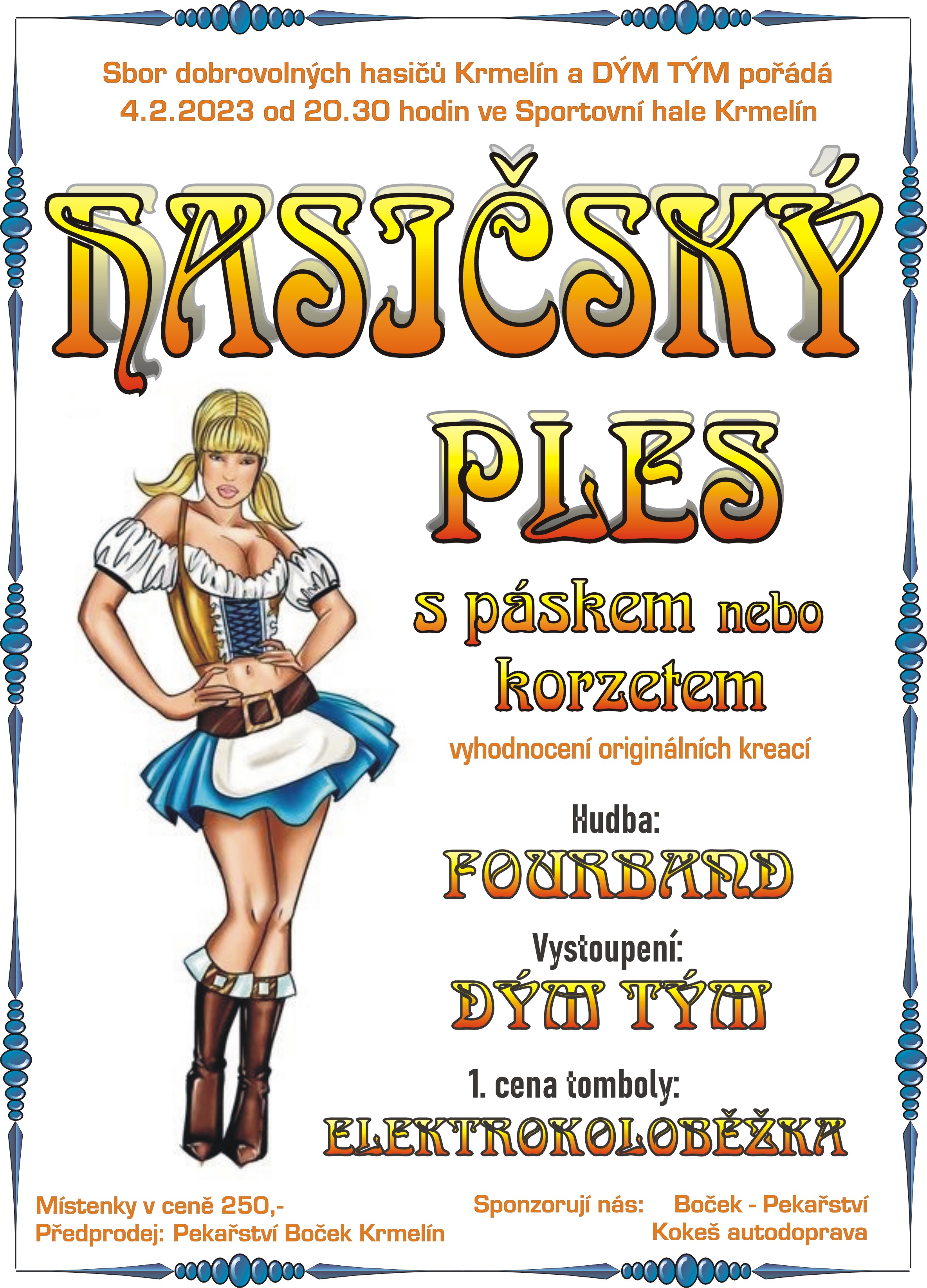 Hasičský ples 2023 - infoVšichni finalisté soutěže o nejoriginálnější nositele korzetů a pásků s vítězem uprostřed. Po třech letech, kdy pořádání plesu bránily covidové opatření byl v sobotu 4.2.2023 uspořádán hasičský ples v Krmelíně. Jako symboly plesu byly letos vybrány korzet a pásek. Účastníci byli u vchodu přivítání panákem alkoholu. V úvodu plesu byl představen program, možnosti občerstvení, večeří ve Sportklubu a pozvání do pekla na široký sortiment alko a nealko nápojů. Kapela Šajtar nemohla z důvodu absence jednoho z členů vystoupit a tak ji nahradila kapela 4Fourband, která hrála i na posledně uspořádaném plese v r. 2020. Hned po zahájení plesu se mohli návštěvníco zabavit psaníčky pro štěstí o drobné ceny, které prodávala sličná čertice v pořádném korzetu, vyhrát se daly malé a velké panáky alkoholu, nealko a drobné pochutiny, byly zde i hodnotnější ceny jako láhve vodky, bufet, večeře, hlavní cenu - rýžovar se nepodařilo předat vítězi, který byl odměněn lahví Metaxy. Soutěž o nejoriginálnější nositele těchto doplňků už příliš netáhla, dostavilo se pouze 7 účastníků(nic). Na třetí místo vybrala porota pána s opaskem na cvičení, za druhé místo získala paní s páskem, vyrobeným z perel, a vítězství přiřkla vedoucímu mládeže P. Edelsbergerovi, který se prezentoval opaskem ozdobeným medailemi, plaketami a různými plackami. Vítěz nám vytáhl jednu slosovatelnou místenku, jejíž majitel byl oceněn cenou. Vystoupení Skupiny DýmTým bylo složeno ze 3 částí, v první na píseň Aqua Barbie Girl skupina naběhla do sálu a předvedla tanec zamilovaných dvojic. Pokračovalo částí 2. – na hudbu z filmu Pulp fiction, kdy se do sálu dostal jeden člen s Meme J. Travolty a procházel se mezi tanečními dvojicemi. V poslední části všichni vystřihli taneční kreaci na Rasputina od Boney M. V přídavku zopakovali 2. část a tanec zakončili tancem kuřátek. Tombola měla hlavní lákadlo v podobě elektrické koloběžky MS ENERGY e10 od Pekařství Boček, také zde byly elektrospotřebiče od p. Kokeše a poukaz na střelbu do Staré Bělé, k tomu další různé a hodnotné ceny, pochutiny, láhve vína i alkoholu a mnoho dalších užitečných předmětů. Kapela 4Fourband přinutila všechny tancovat až do pozdních hodin s ukončením v čase 3.15. hod. a návštěvníci mohli být na hasičském plese určitě spokojeni. Kapela hasičského plesu 4Fourband. Aktualizováno (Úterý, 04 Červenec 2023 07:21) |